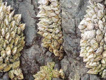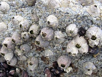 | 潮が満ちてくると殻口から蔓脚(まんきゃく)と呼ばれる足を延ばしたり、揺らめくように動かすことで、海中に漂っているプランクトンを捕らえて食べています。 |