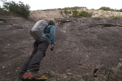 一般の登山道から外れ、クライマーが岩の取りつきに向かう秘密のルート。ロープを頼りながら下っていくと、足がすくむような岩場のテラスにつきます。下から吹き上げてくる風が気持ちいい?(怖いかもね)